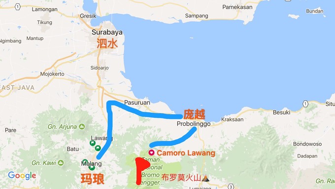 布罗莫火山交通的起点是庞越(Probolinggo),但游玩的起点是CamoroLawang(火山脚下的小镇),所以你可能需要从雅加达/泗水/日惹/玛琅/巴厘岛等等地方先到达庞越。因为布罗莫是印尼非常有名的旅游景点,所以庞越的交通非常方便。我此次是从玛琅抵达庞越,所以下面介绍如何从玛琅到达布罗莫。