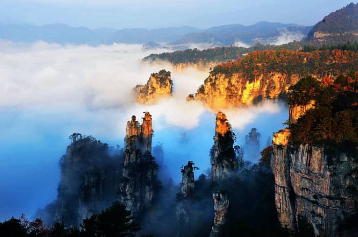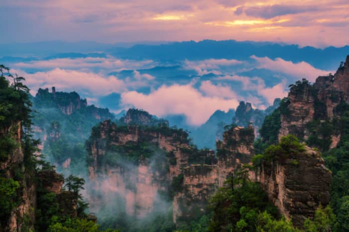 到达天子山之后可重点看一下御笔峰,仙女散花,贺龙公园等景点,随后我们坐环保车出发袁家界,袁家界也是整个森林公园的最核心的部分,西游记,阿凡达等电影都是在这里取景的,这里有天下第一桥,哈里路亚山,乾坤柱,百元大钞,迷魂台,悬浮山等景点可以观看,大家可以在这里看到整个张家界喀斯特地貌的全景,景色也是非常的漂亮,袁家界建议游览时间为两个小时左右,大家可以在这里进行休息,吃点午餐,忘记给大家说了,来的时候呢,最好带点干粮,山上的食物偏贵。