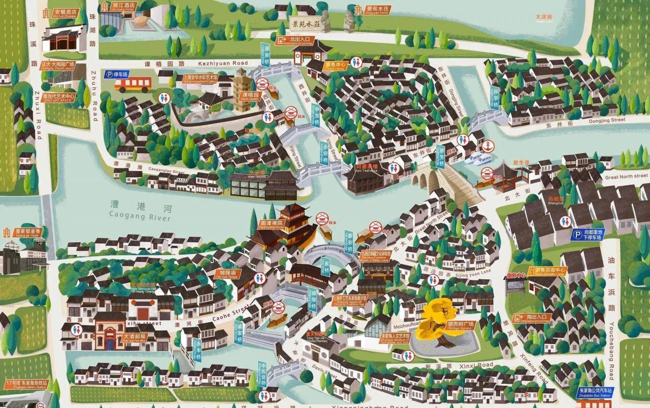 街上沿河分布着课植园、圆津禅寺、城隍庙、大清邮局、王昶纪念馆等景点。