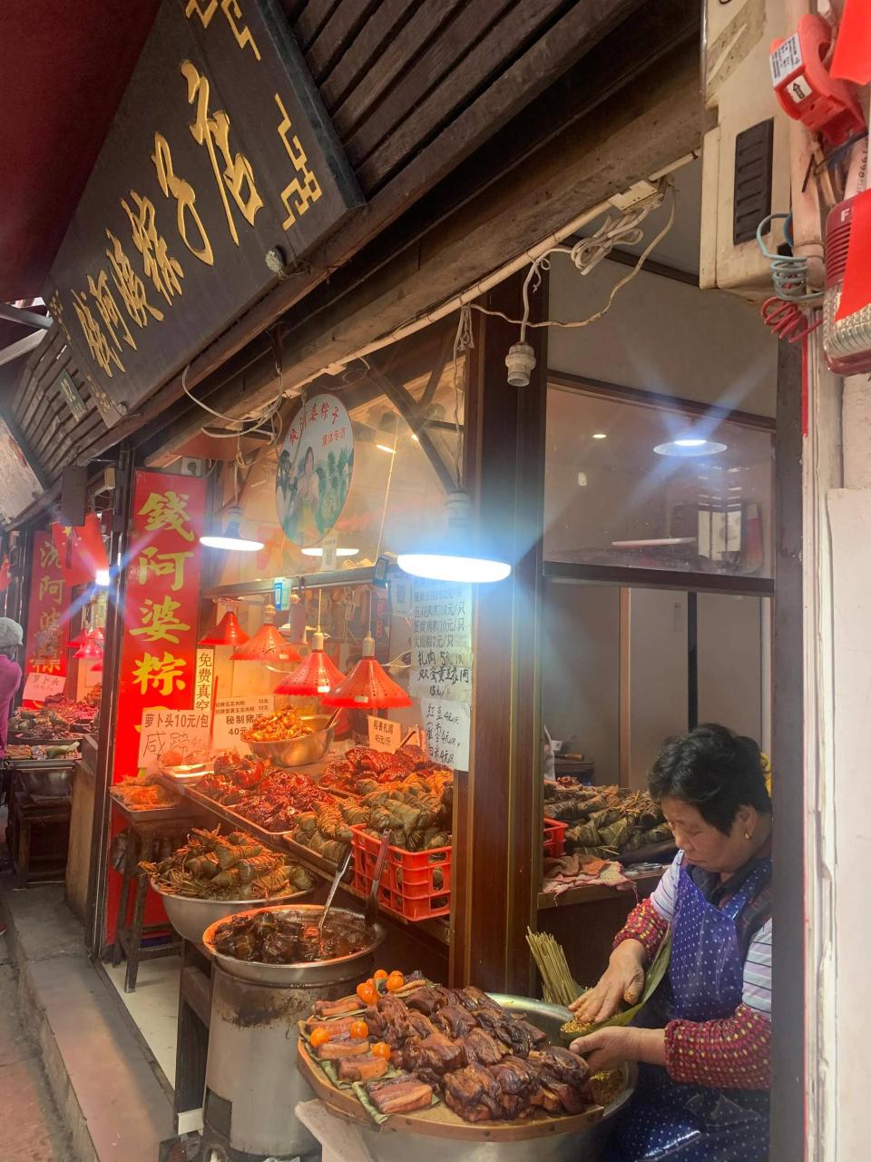 7.油滋滋的走油肉,亮闪闪的猪蹄膀,旁边一位阿婆在那里包粽子。