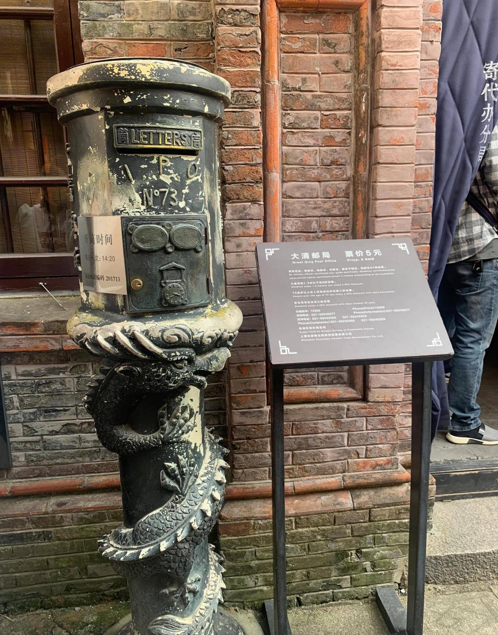 大清邮局的门口,屹立着一支大清时期的邮筒,保存相当的完好。下面是一条青龙活灵活现,上面凸显四个字,大清邮政,上下排列。