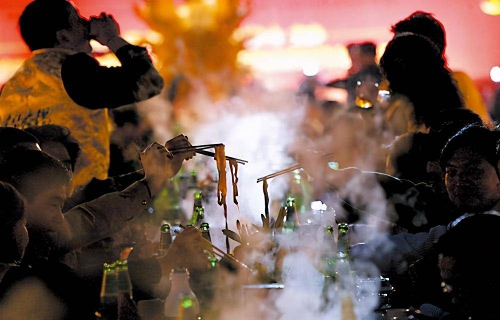锅中的牛肉伴着辣椒翻滚、一双双筷子挑起细白的鸭肠,围着火锅的人们被辣的一边喝饮料、啤酒,一边忍不住再去捞上一筷子食物。彼此之间,是大声的聊天和肆无忌惮地说笑,以及豪气地推杯换盏。