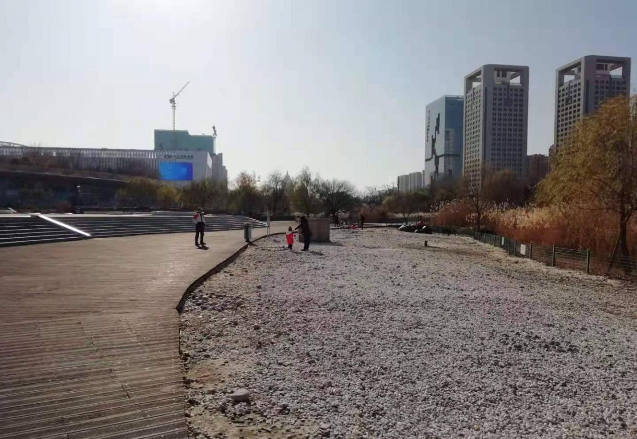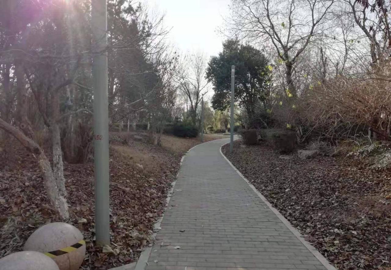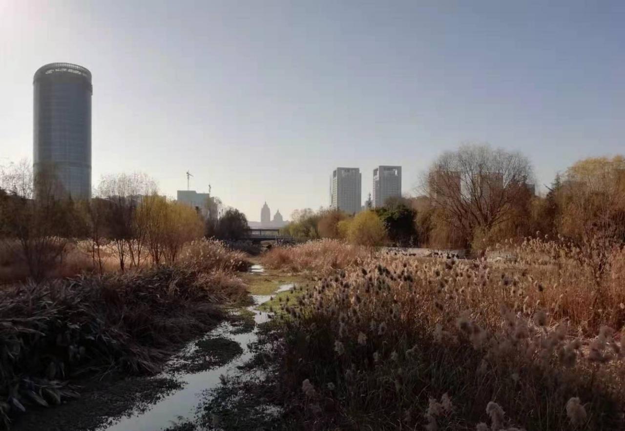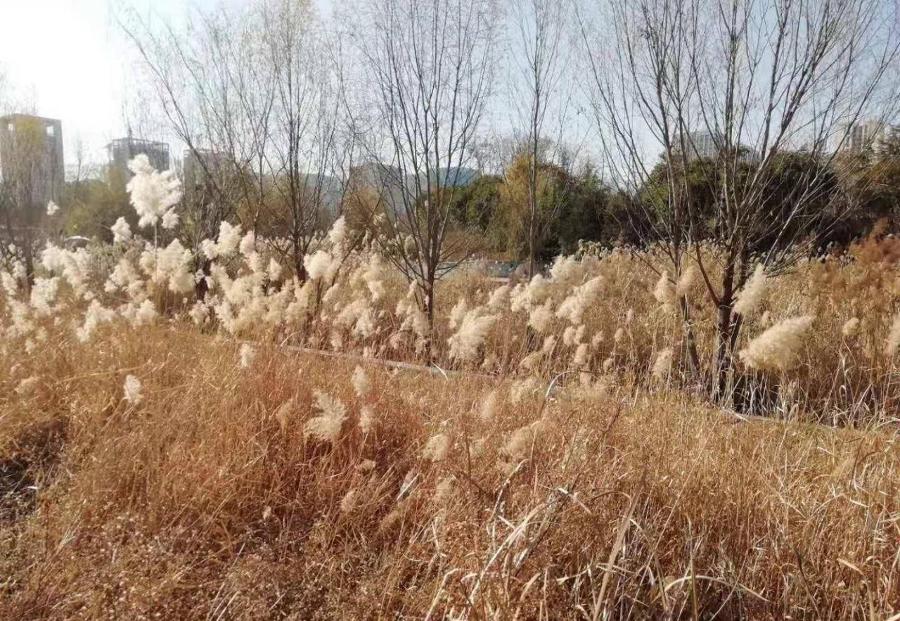 顺着曲径通幽的林荫道,我走马观花般游走着,沿途将各处的精巧建筑和绿化景观仔细打量。只见蜿蜒的河道里,部分河道河床似乎已干涸,河两岸茂密的芦苇早已枯萎,大片就地倒伏,在冷风的吹拂下尽情摇曳。站在木桥上远望,整个河道风光带显得有些萧瑟寂寥,游人相比以往也少了很多。相比那绿意盎然、吹拉弹唱的春夏游乐盛景,真是冷清了好多。好在密林里的鸟雀欢叫不止,似乎想努力给冬日河景增添一丝热闹和生机。