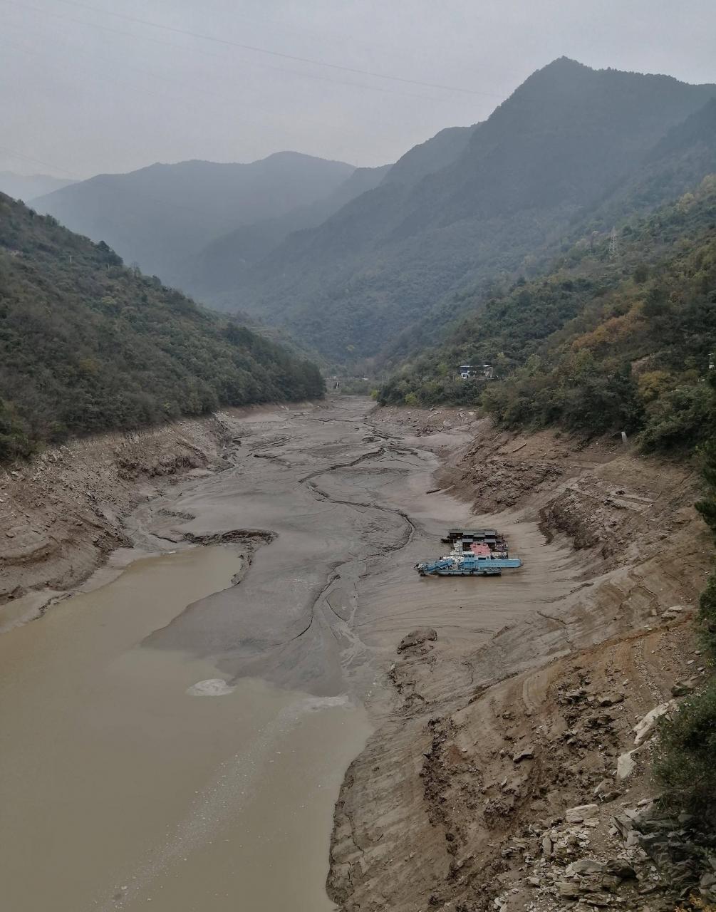 石门水库上游的褒河,水位下降,游船搁浅