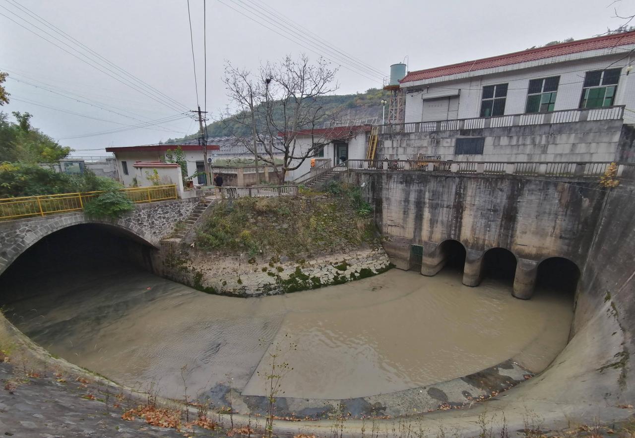 石门水库大坝下面,河水浑浊,施工声不绝于耳