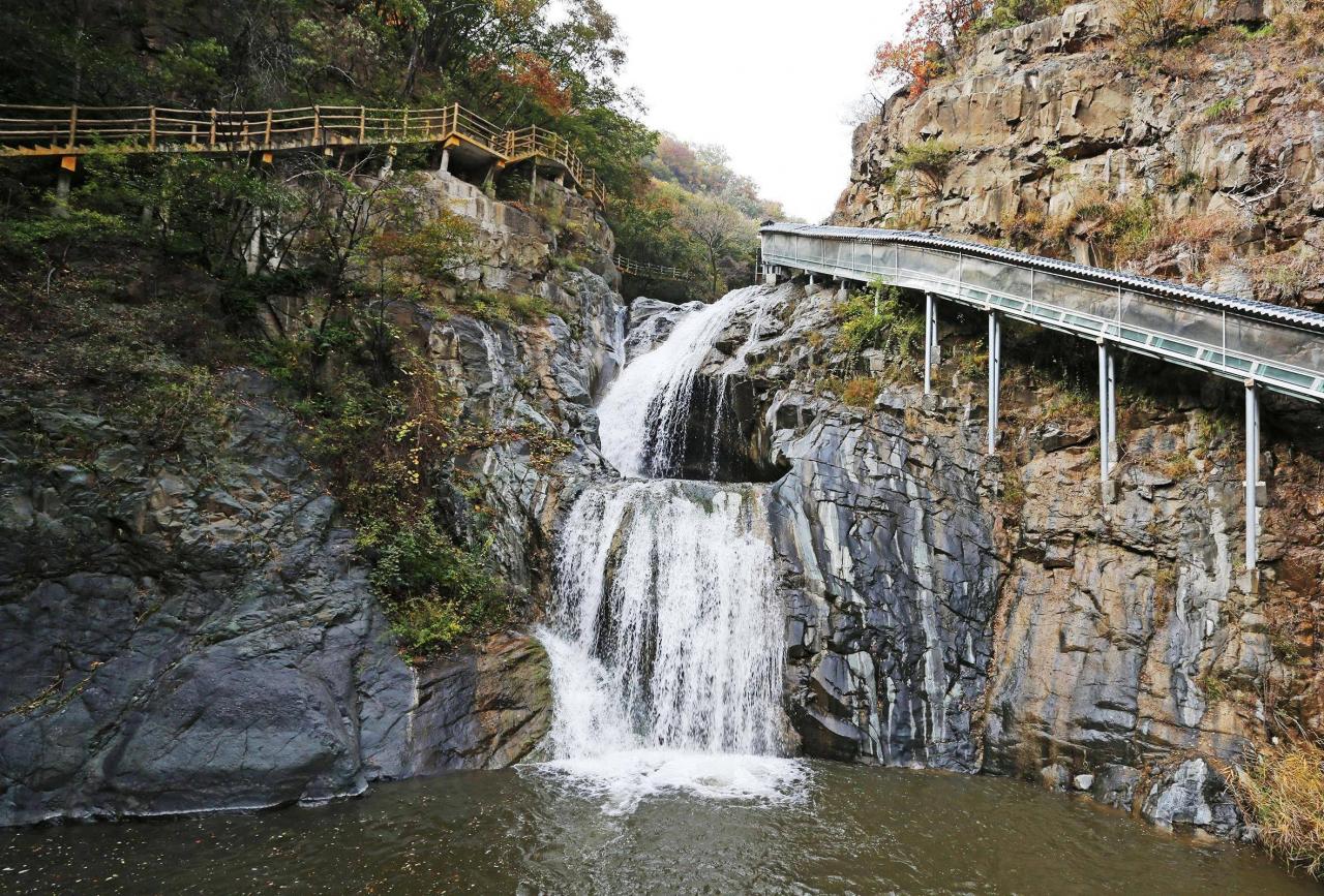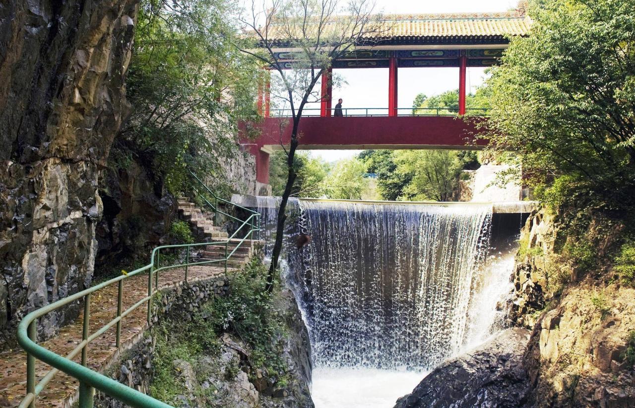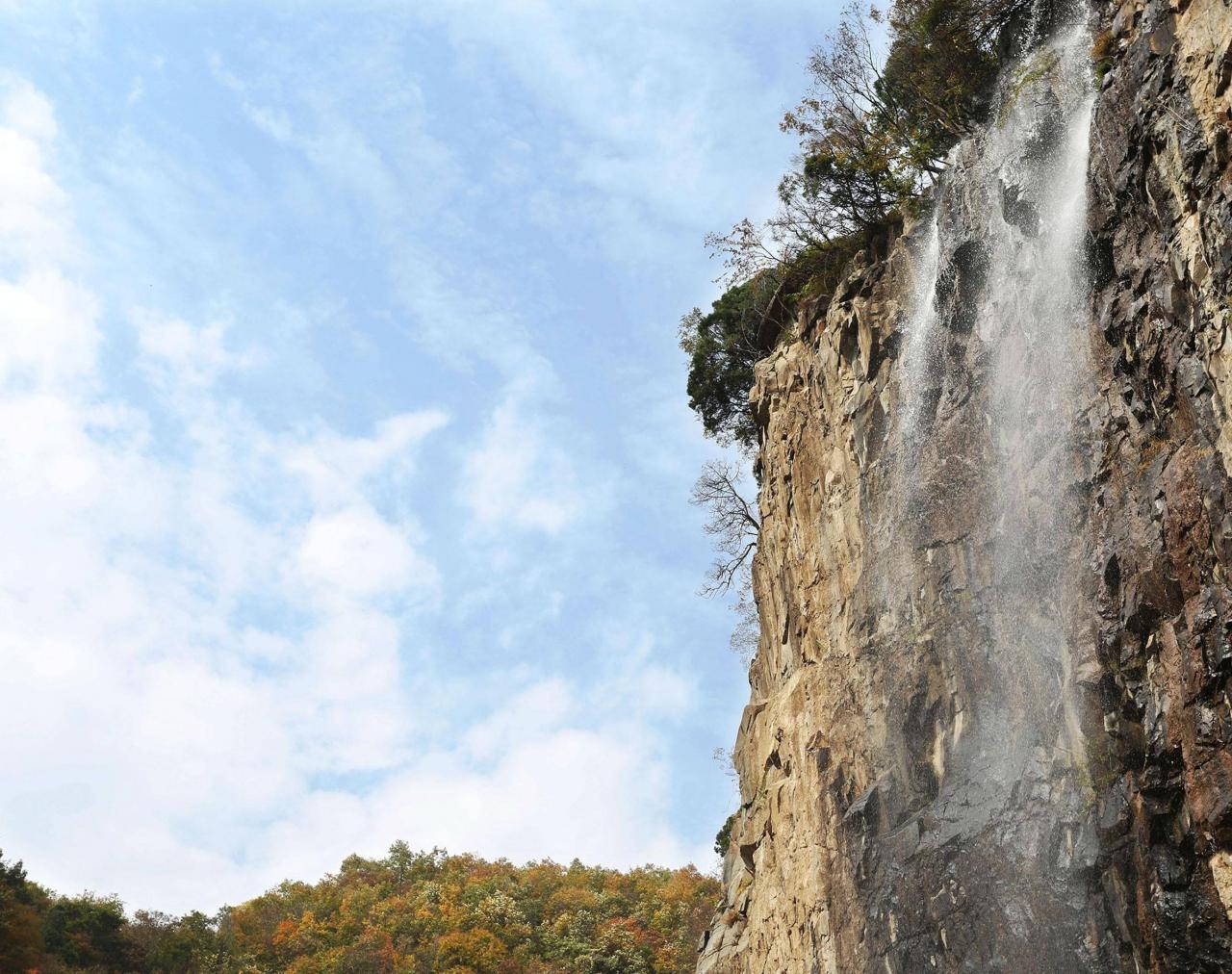 景区第一道景观就吸引了众多影友:一个仿古式走廊下面便是壮丽的第一道银帘瀑,落差两丈左右,发出哗哗的响声,震耳欲聋;瀑布在阳光的照射下,银光透亮,象珍珠,象银帘,好看极了,怪不得每年都有许多美术爱好者到此写生绘画呢!