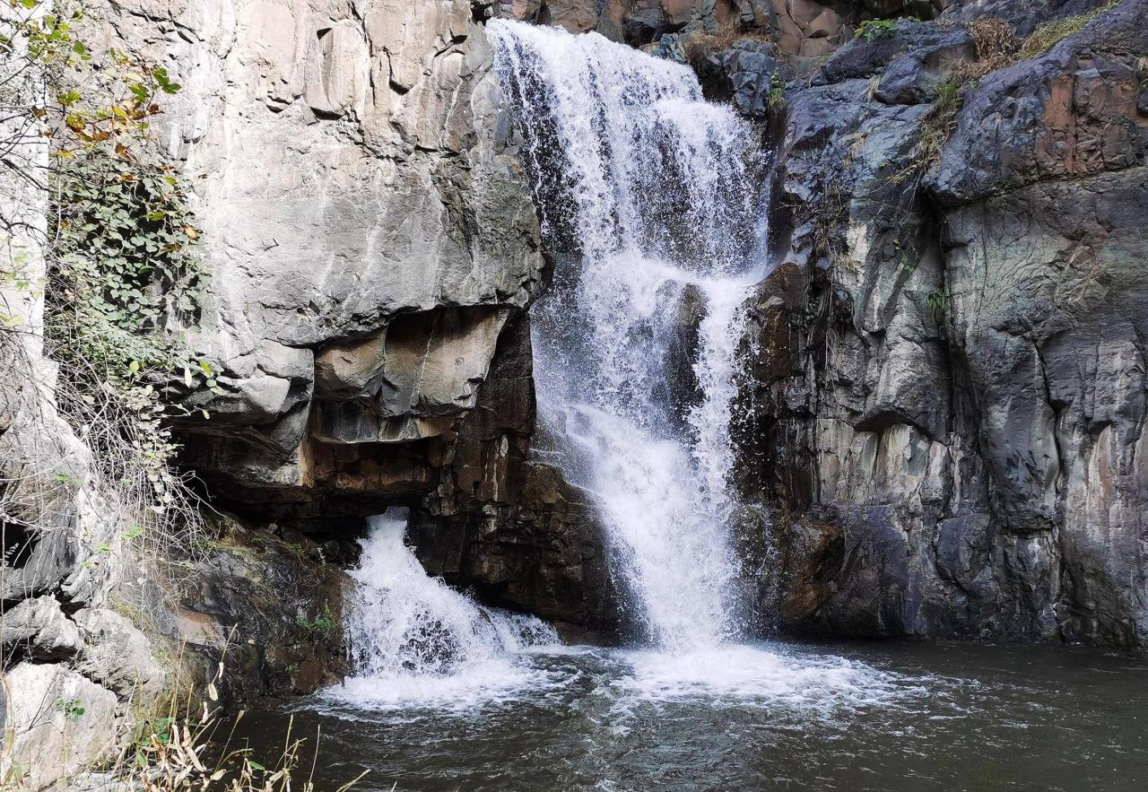 再前行至大峡谷中段,这里便是景观最丰富的地方。一个几亩大的青石板地面,躺在这里睡一觉也是一种别样的享受;抬头看,百十米高的悬崖上冒出一股股清水,恰似银河落九天,与蓝天白云相映衬,真是好看极了!