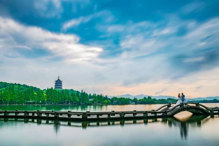 您在苏堤站下车,下车之后您便来到我们西湖的小南湖,这里人不多,景色漂亮,对面是太子湾公园,你也可以去我们爱情公园去打个卡,最重要的是到了西湖一定要去乘坐一下西湖游船,推荐您我们西湖非常生态的电瓶游船,两个人乘坐游船上面环境特别私密。西湖游船乘坐之后的话呢,您的停靠点便是我们杭州西湖时景之一的花港观鱼公园了,在花港观鱼公园里面,您可以逛逛我们杭州最美的公园,与此同时,还可以喂喂我们那些肥胖的大红锦鲤,花港观鱼公园您游玩之后的话,记得从西门出去,西门出去的花港观鱼公园一直走路过杨公堤,正前方便是八盘岭路,走到八盘岭路的时候,你会发现路过一座小桥,小桥两岸的景色如痴如醉,如果这个时候你还不饿的话,您可以往小桥左手边走,那里是杭州西湖的私密景点叫浴鹄湾,西湖大学美丽的景致都在那个地方,您看看这景色也是我们杭州穿汉服的小姐姐最爱拍照的一个地方。