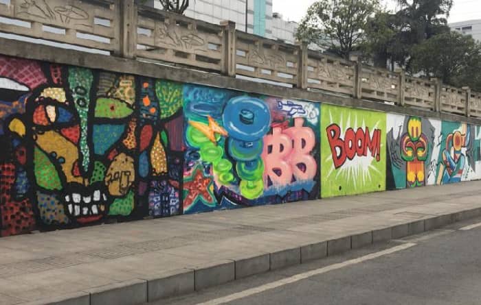 第四个地方,是川美涂鸦街,疫情期间学校进不去,就在外面拍吧,整面墙全是涂鸦,文艺范十足,想怎么拍就怎么拍。