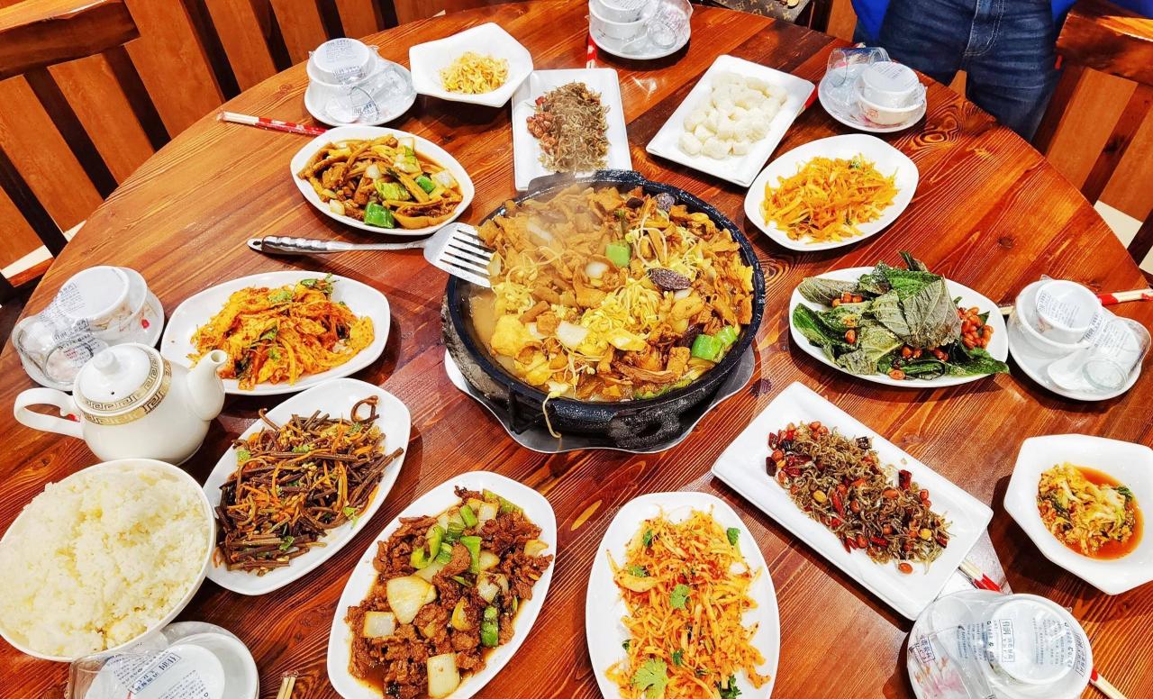 我们一桌餐,地道的朝鲜族特色,菜可以都放盆里,右上角还有个苏子叶拌菜