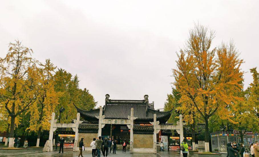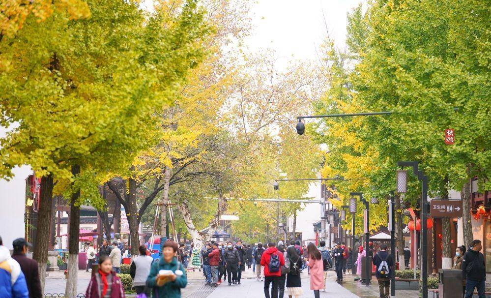 街道两旁商铺林立,金灿灿的银杏叶与朱红建筑相映成辉。街头,全国各地的游客接踵而至,人来人往,很是热闹。