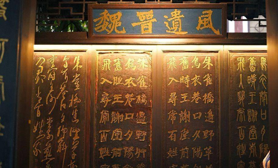 在纪念馆门口就能看到在屏门上的《金陵怀古·乌衣巷》的古诗,是用真草隶篆四种书体书写的:“朱雀桥边野草花,乌衣巷口夕阳斜,旧时王谢堂前燕,飞入平常百姓家。”