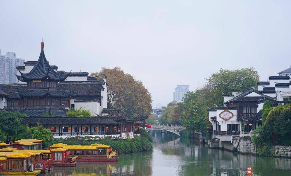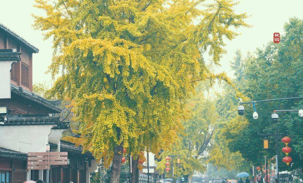 南京城既有北方的大气,又有江南的灵秀。秦淮河畔的银杏树,满树金黄,金灿灿的枝叶在阴天里显得格外鲜艳,也给人温暖的感觉。