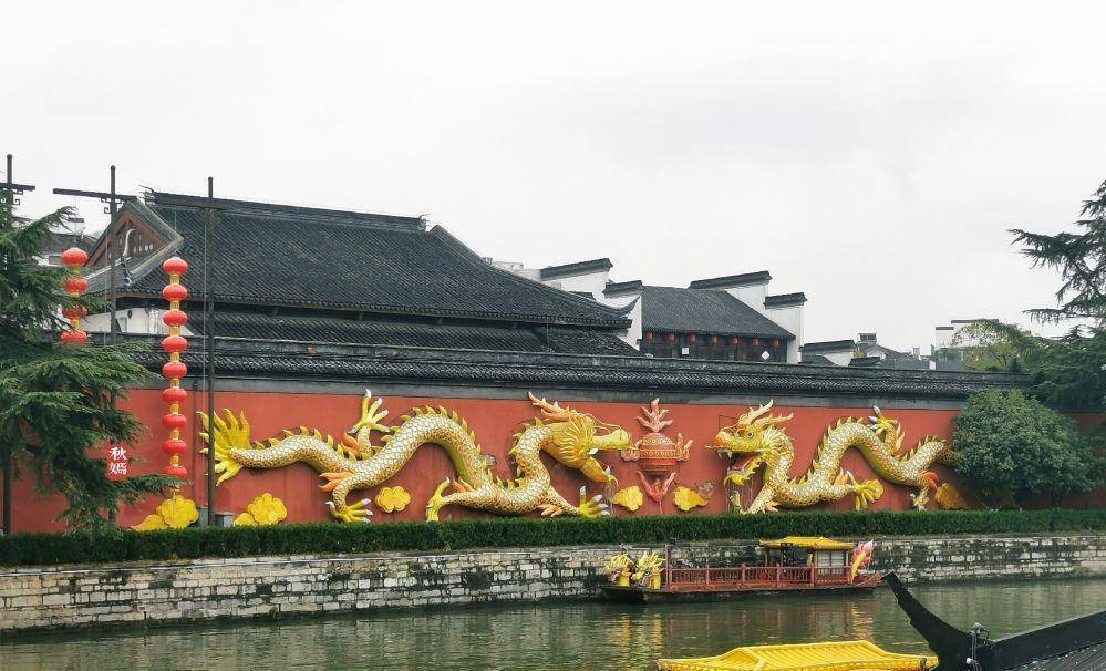 宋代以后,这里的河段就是孔庙的泮池。红色的照壁上刻着二龙戏珠的图案,活灵活现,栩栩如生。