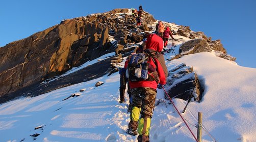 3、背负装备:60-75L背包+18-30L冲锋包、防雨罩一个、登山杖一根最好是双杖。 4、穿衣装备:羽绒服+冲锋衣+抓绒裤、保暖排汗厚袜子、中帮或高帮防水登山鞋、防寒帽、雪镜、、墨镜、防水保暖手套。