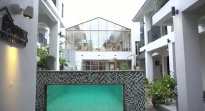 纯白庭院搭配摩洛哥风格的翡翠泳池,一半望山,一半临溪,很适合休闲发呆。泳池的尽头是一栋两层的玻璃星空房,地中海风的餐厅,可以用餐和也可以喝咖啡。交叉纵横的走道,像是一座迷宫城堡,平常应该要1000多元的景观房,现在只要319元就能打卡。