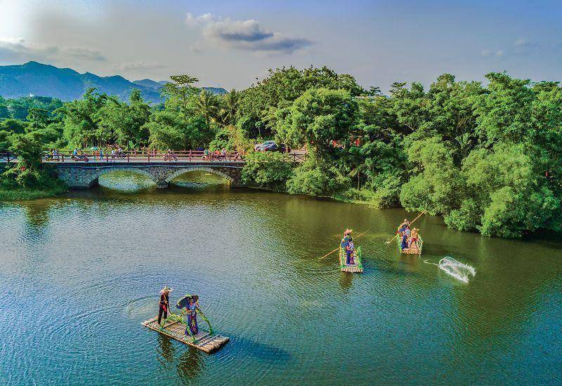 村子里面的绿化做得还是很不错的,里面的湖泊面积很大,每天都有两场水上的演出,当地黎族人吹着乐器乘竹船,算是很值得一看的演出,湖泊进村走三百米就可以看到了。