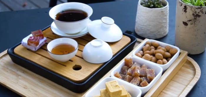 在高品的凤凰木下,喝古早味下午茶,配有绿豆糕,鱼皮花生,姜糖等闽南专属茶点,很适合一家人来这里泡茶话仙。