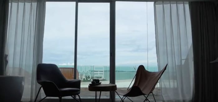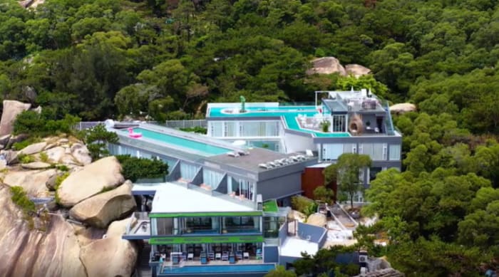 冷淡风的外观设计感十足,自然和建筑巧妙结合。在这里,室内居然能看到裸露的岩石。180度全海景房,70坪的超大空间,简约而轻奢。