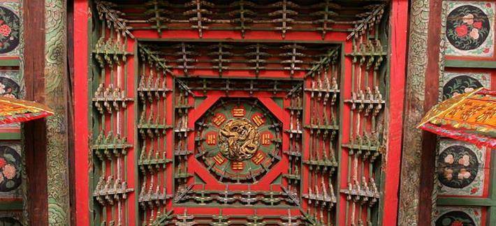 药师殿的天花板构制也是十分精巧独特的,在方格中绘制了草药、花卉等图案,一个小方格中便是一株草药图案,正中心还有贴金的浮雕盘龙,然后采用斗拱的构制按照八卦图,依次向内收缩,这种奇特的结构在北方的寺庙中也是少见的。