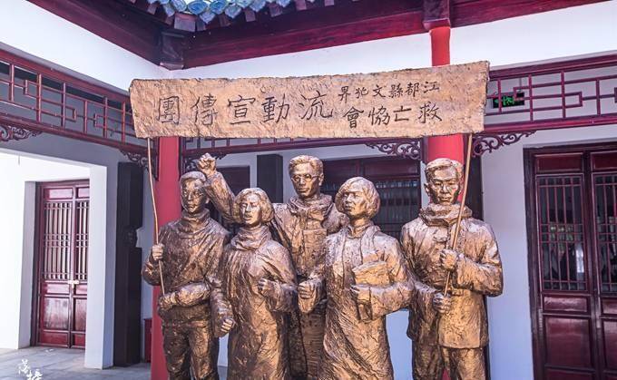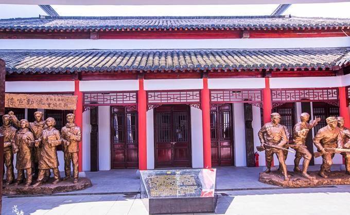 白墙灰瓦的江上青纪念馆是整个纪念公园的中心。还没进大厅,门口的那组雕塑就映入眼帘。人影立于两侧,栩栩如生,记录着光辉的战斗岁月。