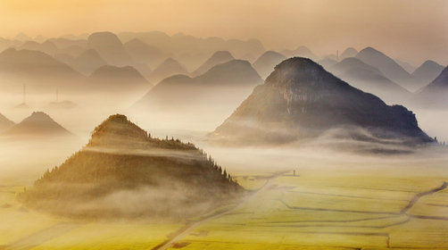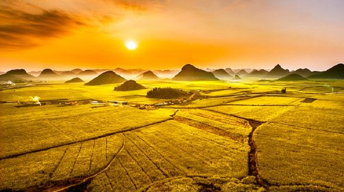 罗平的早晨是有很多晨雾的,早晨7点-9点的时候站在金鸡山上,无数个圆圆的小山丛在雾海中冒出来,太阳在花海中穿梭,很多农人在那里耕作,十足的田园气息;下午4点以后从晚霞到日落,慢慢温柔的光线洒在花海上,锥状的峰林点缀在期间,美的像一幅油画,所以很多宣罗平的旅游照片都是出自金鸡峰丛的。