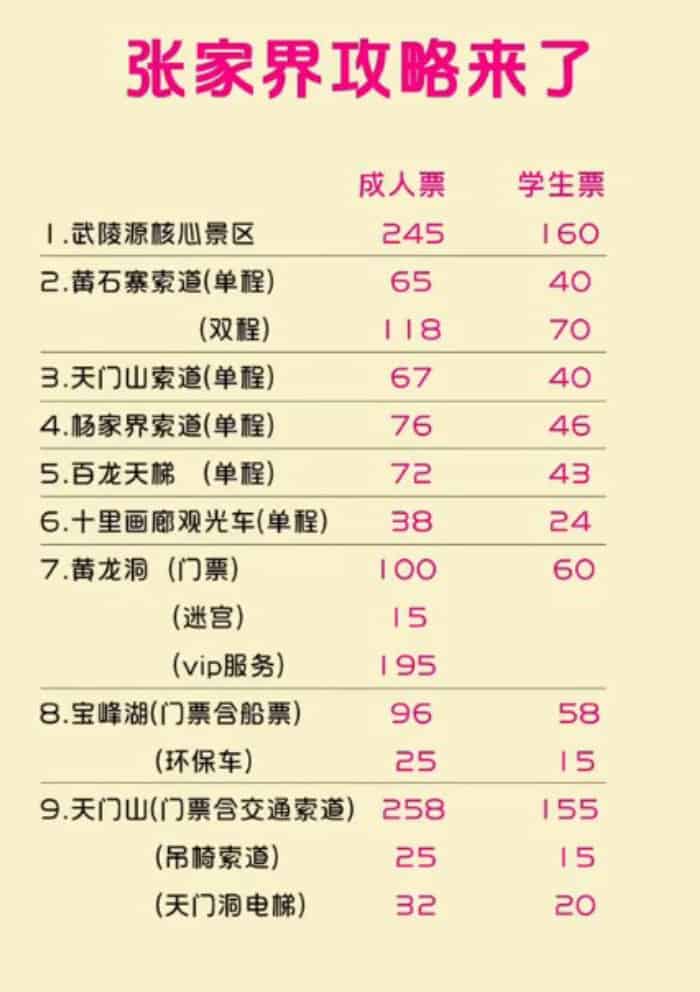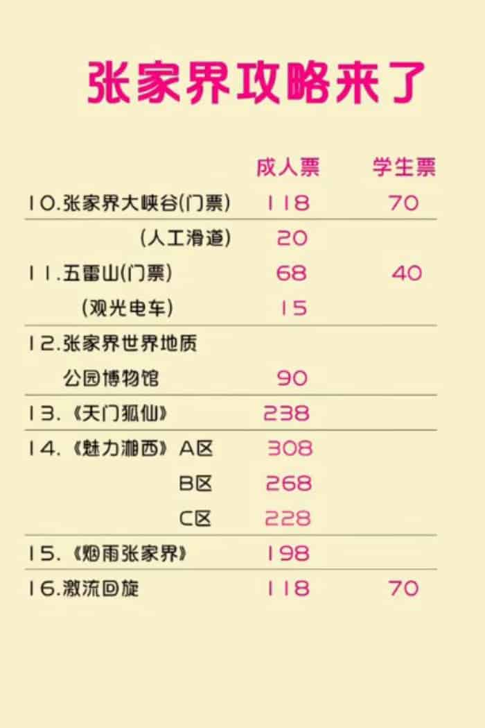 这是张家界景区所有门票的价格,分为三大块景区,武陵源景区、天门山景区、大峡谷景区,武陵源森林公园是大多数人的首选,主要景点也帮你们整理出来了,非常推荐魅力湘西,现场舞美非常震撼,来张家界一定不要挑逗景区的猴子,你知道为什么吗?