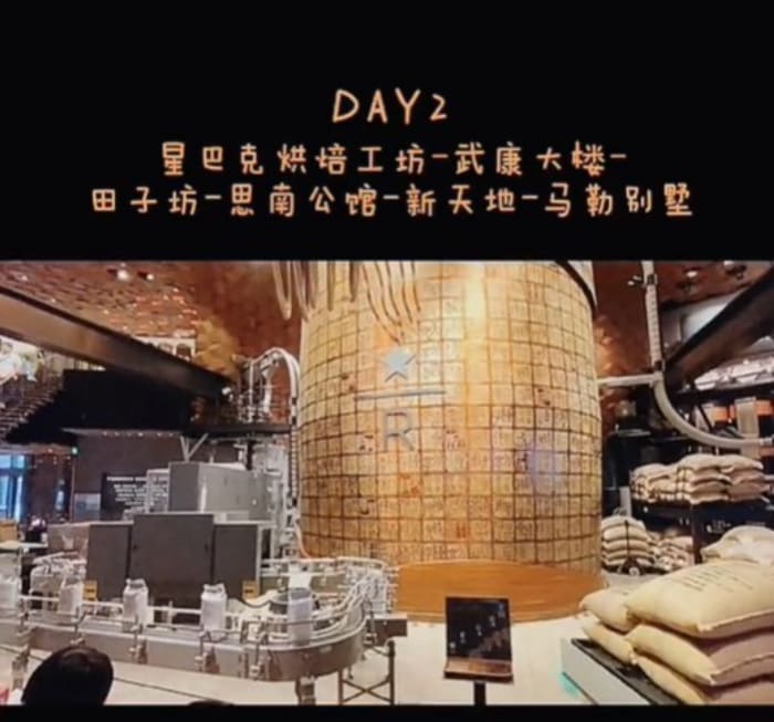 第二天呢,一大早,去星巴克烘焙工坊,在南京西路789号,不要门票,非常推荐。田子坊和思南公馆啊,都特别适合拍照片。到了饭点,可以去新天地,上海的网餐厅啊,这里占了一大半。美食推荐,佳家汤包,弄堂小馄饨食府,阿大葱油饼,涌上来大食堂。