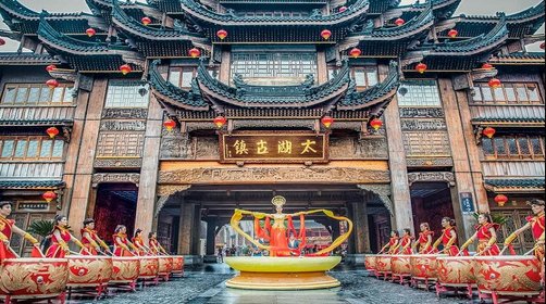 太湖古镇比较适合晚上去,因为晚上会水舞秀、歌舞秀表演,可以感受太湖版的"大唐不夜城"。