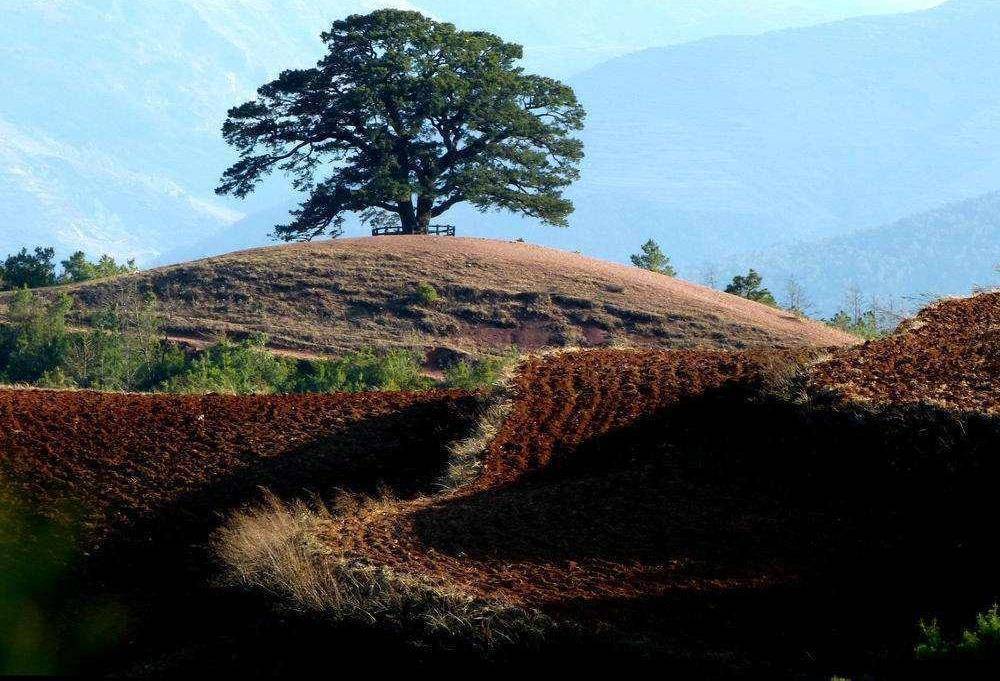 景区内有一株老龙树,又被称为神树。这是一棵拥有一千年高龄的巨大冷杉,曾经枯死,于三年后重吐新叶,当地人发现它死而复生后便为其立碑,奉为神树。千年来,这株神树像一个老人,一直关照着这片广袤的红土地,而如今它也成为游客来到东川红土地景区的必访之地。