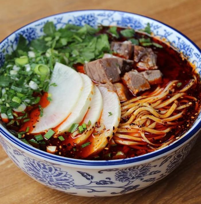 早上,来一碗牛面,记住兰州是牛面,不是拉面,二细大宽随你挑,辣子蒜苗要多少就有多少。