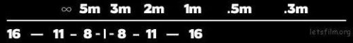 在上图中,中心位置对准 ∞,表示对焦点在无穷远上,而下面的光圈范围则表示,如果选择 f/8 的光圈,那么主体在距离你大约 5m 处一直到无穷远处都处在景深范围内。