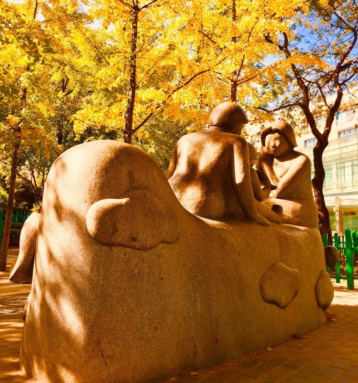 门口两边的两座石像,都是三口之家,父母抱着孩子一起玩耍的场景,每个人物都雕刻的栩栩如生、活灵活现的,很可爱、很精致的景观。