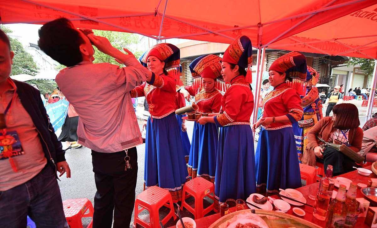 接龙桥被红布装点得喜气洋洋,迎客的队伍们浩浩荡荡,在司正的带领下,4名头戴一字巾帽、身穿酱红宽领右衽长袖衫的司仪和4名身着圆领彩衣的吉祥童子欢喜着迎客。