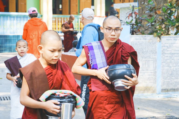 1)布施千年以来,风雨无阻、雷打不动的布施仪式在西萨旺冯大街上演。如今,布施仪式成了游客们眼中的一道风景。每天清晨六点左右,寺庙里的僧人会出来化缘。游客们准备糯米饭、芭蕉之类食品,和当地的信男善女一起跪在路边,等待的僧人路过。