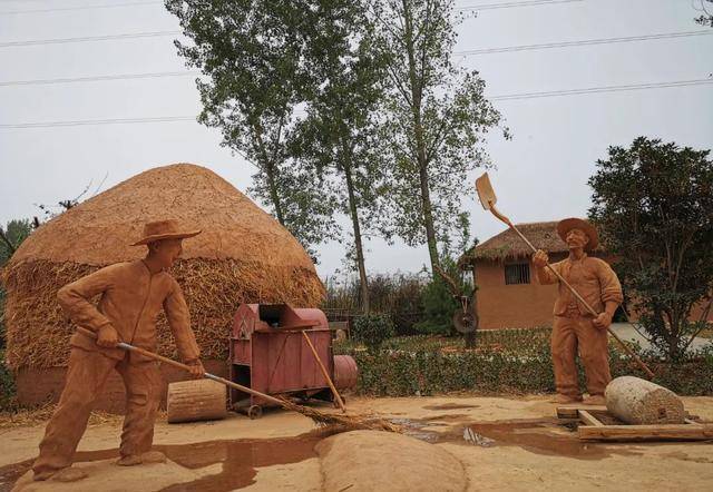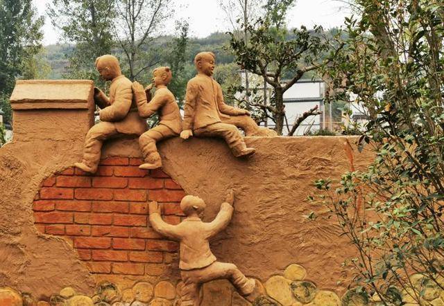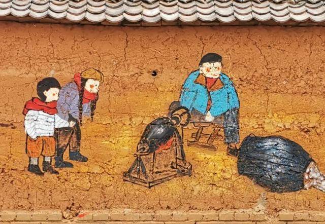 民俗园里,黄泥墙、石磨盘,泥塑、墙绘、土窑,让人感觉回到了数十年前。尤其是墙上的彩绘,有大人们打麦、扬场的农忙场景,有孩子们打陀螺、滚铁环、蹦爆米花的童趣场景,满满的都是乡村的记忆。