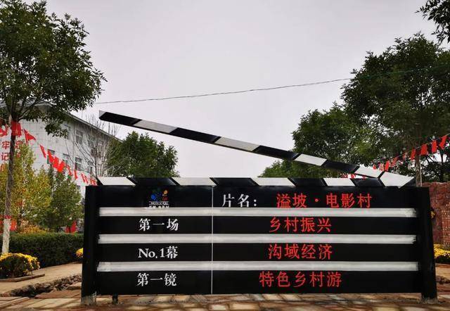 走进溢坡村,村口有一个巨大的“电影场记板”,上面写着“片名:溢坡·电影村;第一场:乡村振兴;No.1幕:沟域经济;第一镜:特色乡村游”,旁边胶片造型的建筑,更让人有置身于影片拍摄现场的感觉。