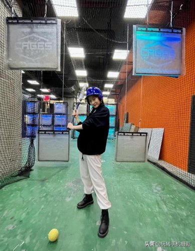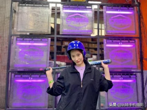 1、在使用人像模式拍摄的过程中,模特最好保持静止不动,可以先让模特站在霓虹灯牌前,配合打棒球的运动场景,用棒球棍作为拍照道具,搭在肩上摆好酷酷的姿势后再进行拍摄。