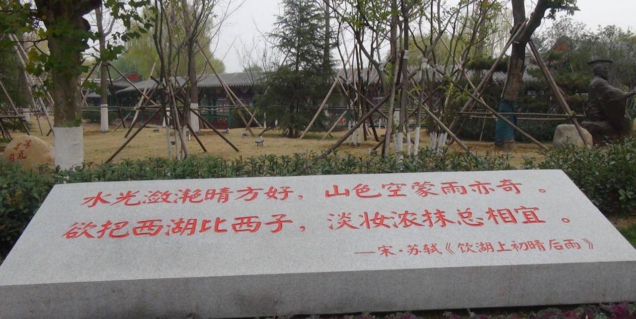 沿北门走进泰山西湖,雕梁画栋的亭廊内,游客三三两两,有的情侣相依,有的扶老携幼,有的朋友相伴,有说有笑,步履执着,凛冽的严寒丝毫阻挡不了他们游玩的热情。走廊两侧的下面,绕行的湖水静谧淡然,缓缓流淌。岸边苍翠中带着微黄的柳梢在寒风的吹佛下沙沙作响,少了些往日的婀娜,多了几分坚强的傲骨。道路两侧摆放着白的、紫的鲜花,努力地绽放着,迎接着远道而来的客人。前方的绿地里,摆放着一块条石,上面刻着宋朝大文学家苏轼的诗作《饮湖上初晴后雨》,红色的大字光彩夺目!