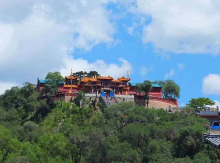 小朝台就是这边的半山腰有一座寺庙叫黛螺顶,如果你的体力不允许你大朝台的话,那你就是从山底走路爬到黛螺顶的那个顶上,这个叫小朝台,这个小朝台以前是专门给皇帝建的,因为皇帝,他不可能每一个朝台都走遍,所以为了他的方便,在这个黛螺顶给他建了一个小朝台。
