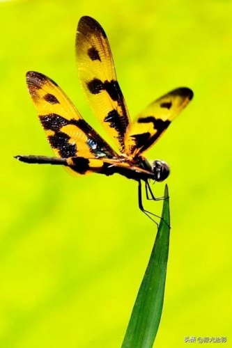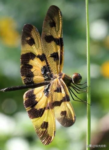 斑丽翅蜻又名彩裳蜻蜓,琥珀色居多,常见于池塘、沼泽和湿地。由于它有一双美丽的翅膀,远远看去会误以为是蝴蝶。它动作敏捷,身手不凡,经常猎杀蝇蚊等昆虫,所以又被称为湿地小猎豹。