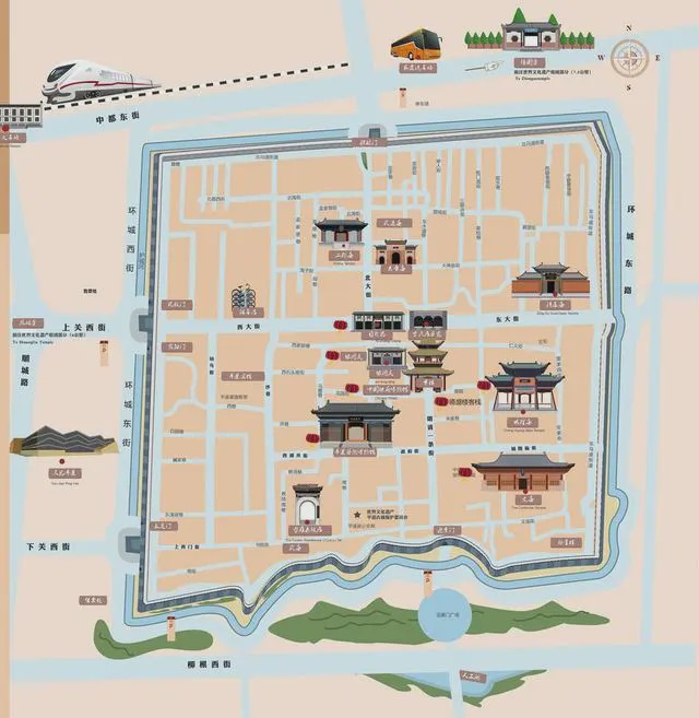 2、 平遥 古城外交通有公交车1路、102路、103路等平遥火车站到平遥古城北门乘坐1路车,一站地;平遥高铁站到平遥古城北门乘坐108路,约40分钟;