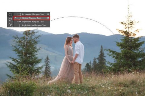 要在Photoshop中开始羽化,请在左侧的工具箱中找到“椭圆选框工具”,然后绘制所需的形状。我在照片中画出了一个垂直的椭圆形,围绕着这对夫妻。像大多数PS选择工具一样,椭圆选框使用硬边进行选择。因此,要获得必要的渐晕效果,您需要使边缘稍微更柔和。