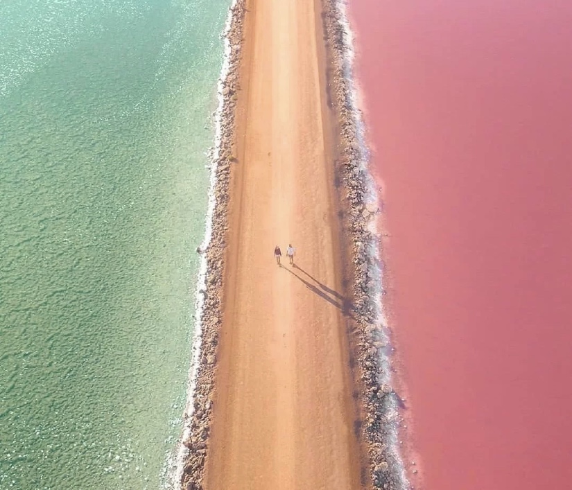 湖内高浓盐度和藻类的变化,使得湖水呈粉红色,以中间笔直的分隔湖水的“西瓜大道”为界,一边湖水呈粉红色,一边湖水呈薄荷绿色,仿佛是上帝在这里打翻的调色盘。