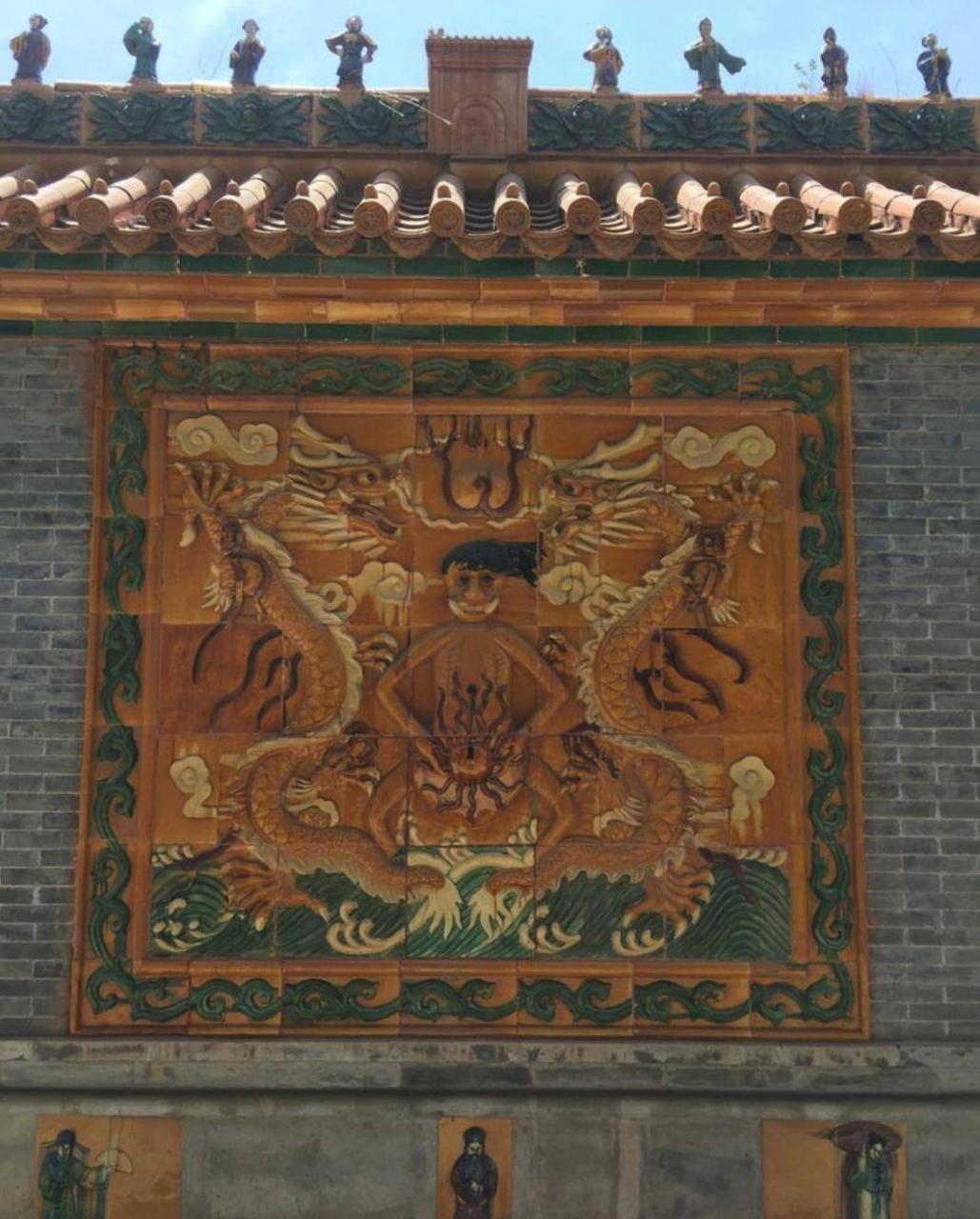 “靠大道”的琉璃影壁就在戏楼外。令人感到奇怪的是,琉璃影壁上二龙戏珠的图案下是一只蜘蛛。据说,这不是一只普通的蜘蛛,而是村里的天气预报员。