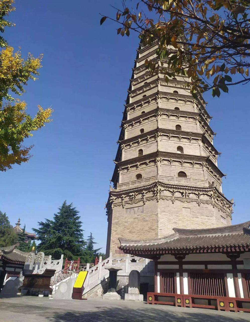 等走得近了,湛蓝的天空下,金黄的秋色里,法门寺的舍利塔灼灼生辉。
