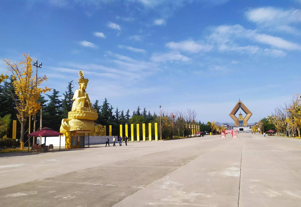 中间,就是宽阔笔直的佛光大道。远远的能看到一两公里外的舍利塔。大道两边很多银杏树,黄叶在阳光下灿灿发亮,好一个秋色美。