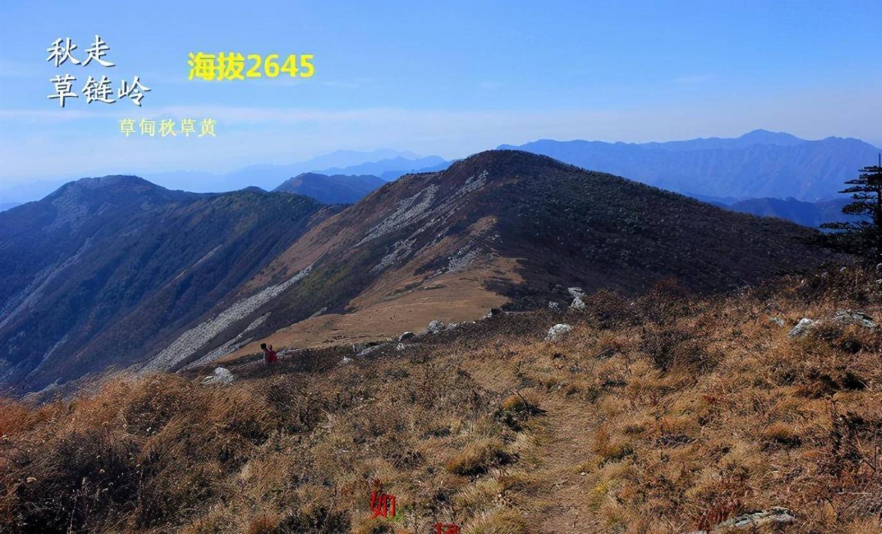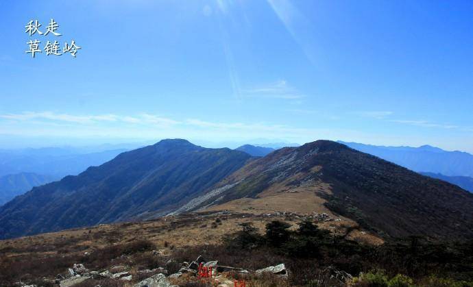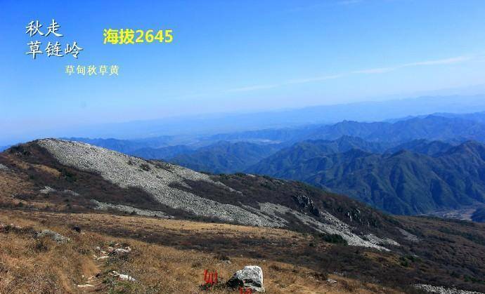 草链岭,秦岭东段第一峰,海拔2645米。岭北刀山剑峰,崔嵬峥嵘;岭南云烟茫茫,山岛耸峙。岭东西走向,数里之长,呈马鞍形,中间凹陷,两头凸起,东高西低,脊线曲柔,地势平缓。白玉般乱石堆,四处散落,似山梁沾满印花。中间凹陷部分,方圆一里有余,树和荆棘全无,尽是羊胡蓑草,绵延敦厚,形成一大片草甸,取名草链岭,名副其实。