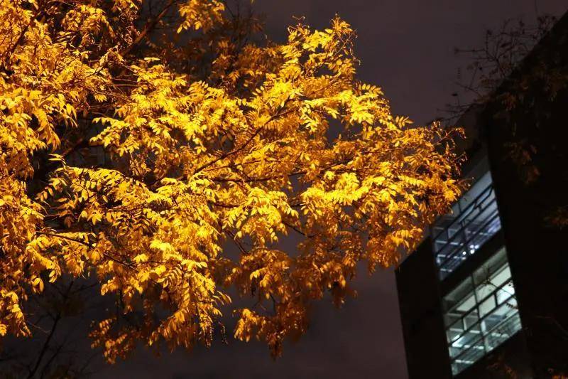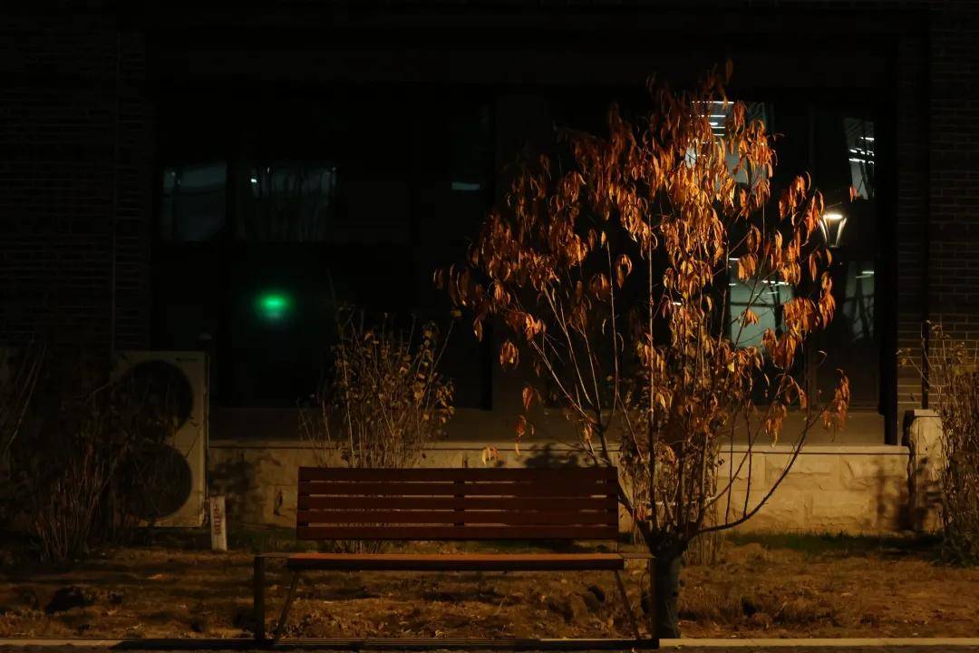 当天色渐沉,星点的灯火将黛蓝的天际晕成霭黄,殷红的叶簇染破秋夜的寂寥,发黄的叶片融于一路的风霜。山大在无边月色中显得静谧安详。
