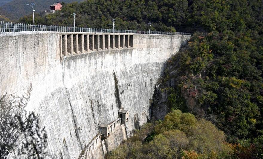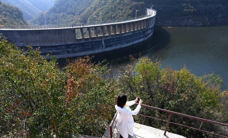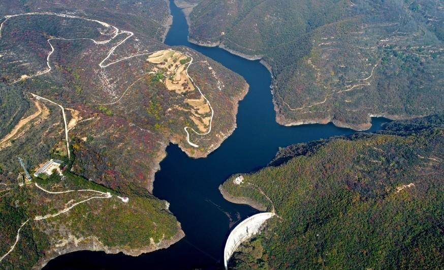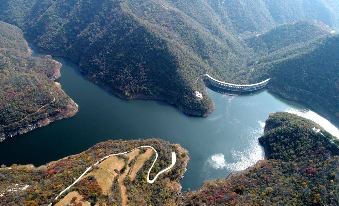 临走时,笔者用无人机飞上高空,俯瞰中条山腹地的大河庙水库全景,但见深秋的红叶点缀在层峦叠嶂、色彩斑斓的群山怀抱中。大河庙水库的大坝好像一弯皎月,依偎在深邃平静的湖水旁边。高处望去,宏伟的大坝在大自然中看起来渺小却醒目,人们就是用自己的力量,改造一方山水来让生活更安稳富足。